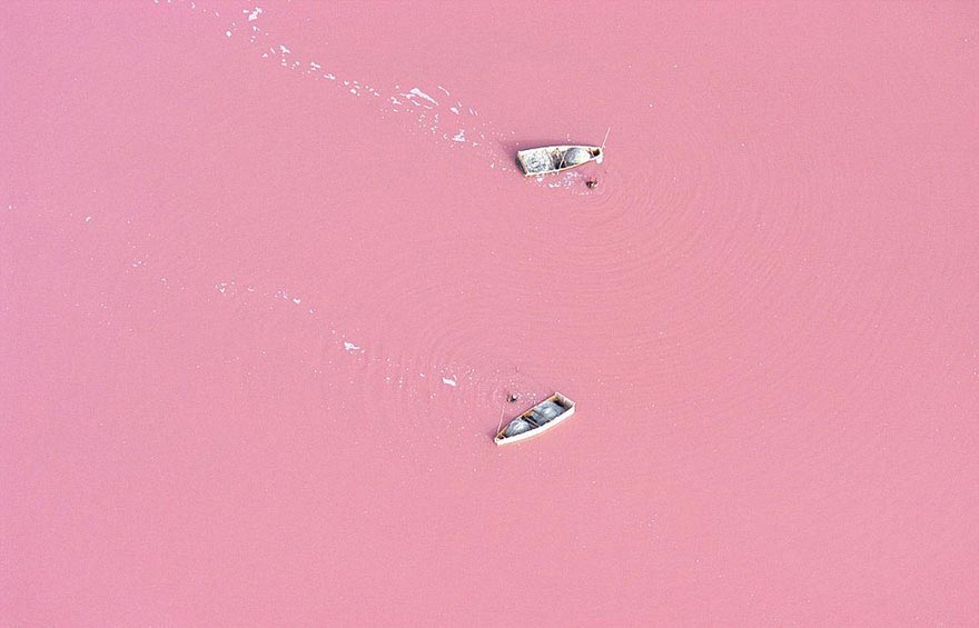 Le fameux lac rose d’Australie ou on peut même se baigner dedans sans danger car l’algue qui provoque cette coloration naturelle n’est pas toxique pour l’homme.