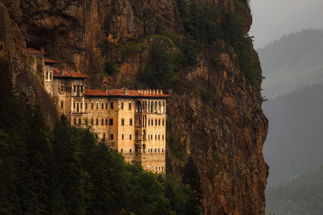 Le monastère de Sumela est situé au pied d’une falaise abrupte face à la vallée de l’Altındere en Turquie. Construit à 1 200 m d’altitude vers l’an 386, la légende affirme qu’après la découverte d’une icône de la Vierge Marie dans cette montagne, deux moines grecs décidèrent d’y construire un monastère. Sumela viendrait de l’expression grecque « stou mela », « melas » signifiant « noir » ou « sombre » en référence à cette Vierge.