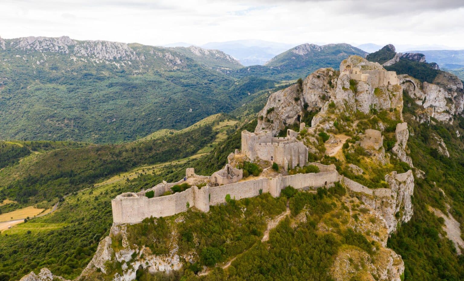 Perché à une altitude de 800 mètres, le château de Peyrepertuse se dresse majestueusement sur une falaise calcaire. Cette merveille de l’architecture médiévale, édifiée sous le règne de Saint-Louis, servait jadis de bastion défensif à la frontière de l’Aragon au XIIIe siècle. Sa conception unique et son histoire captivante font de ce lieu un incontournable pour les passionnés d’histoire.